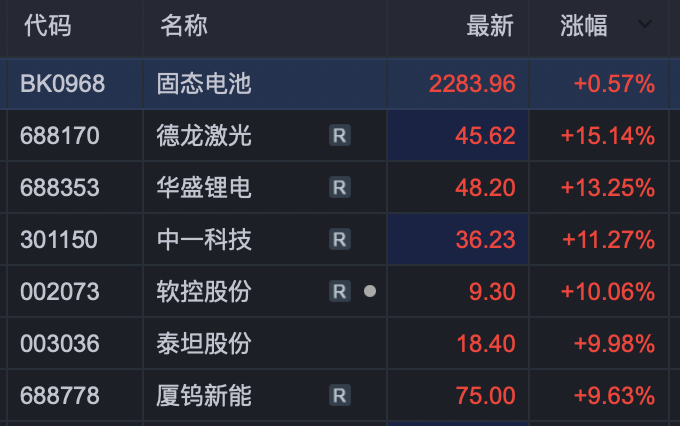 另外,固态电池概念开盘活跃,德龙激光、华盛锂电、中一科技、软控股份、泰坦股份等股涨停或涨超10%。