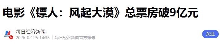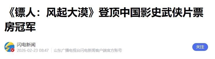 信息来源:每日经济新闻:2026-02-25:电影《镖人:风起大漠》总票房破9亿元闪电新闻:2026-02-23:《镖人:风起大漠》登顶中国影史武侠片票房冠军