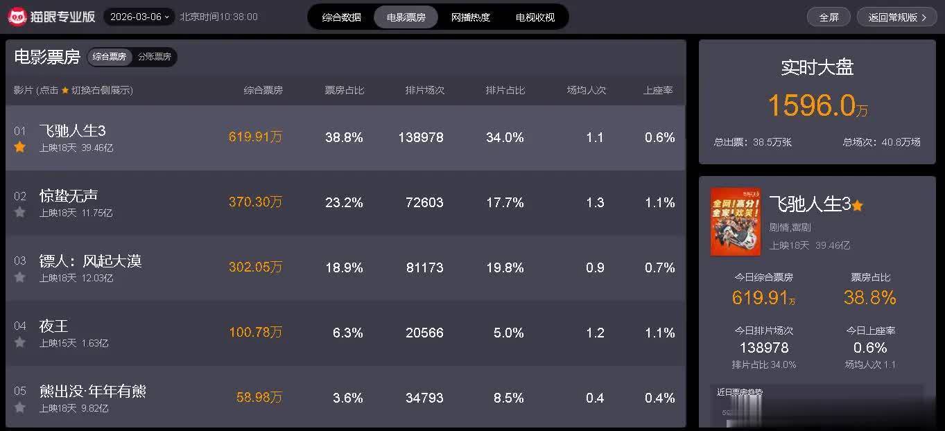 截止3月6日上午10时38分配资APP排名,从“猫眼专业版”实时数据显示可知,当前热映电影中,单日综合票房榜前五分别如下: